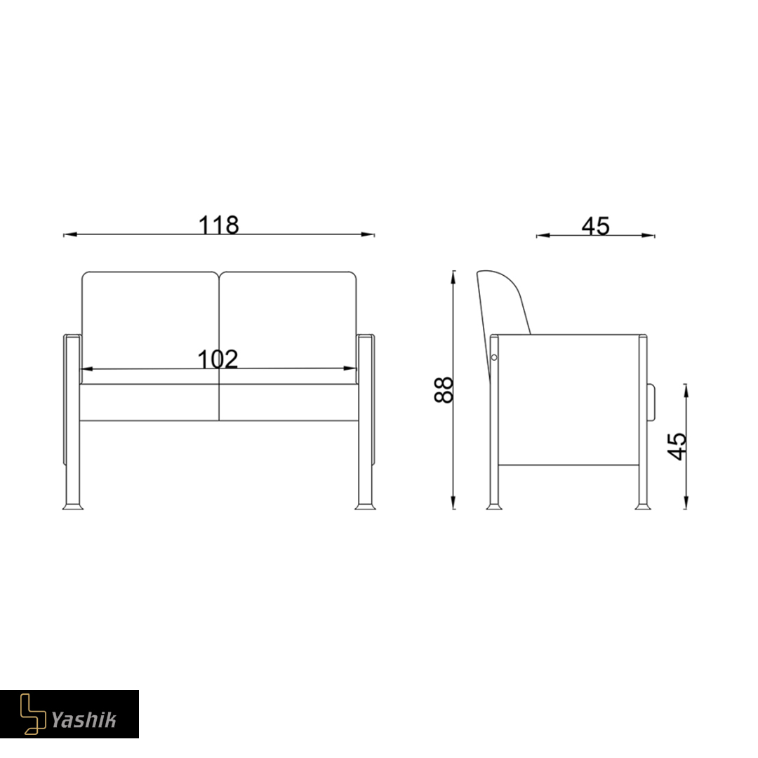 - با طول 118، عرض 45، ارتفاع 88، ارتفاع تا نشیمن 45 و طول نشیمنگاه 102 سانتی متر