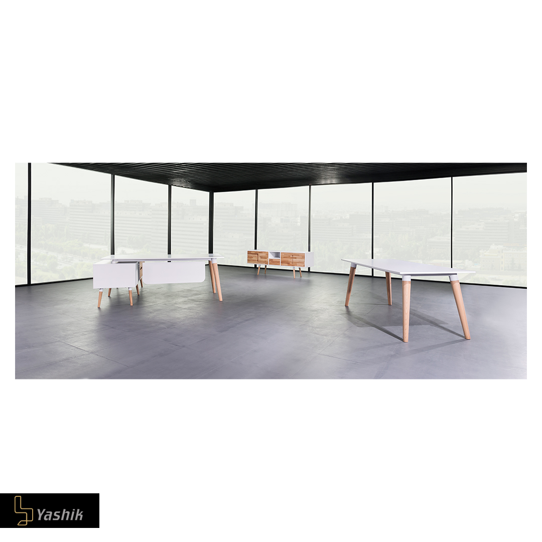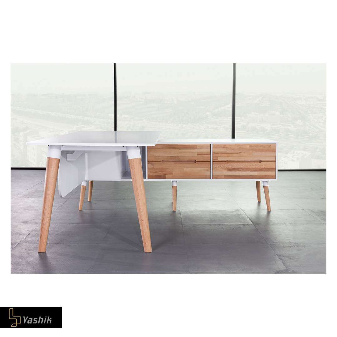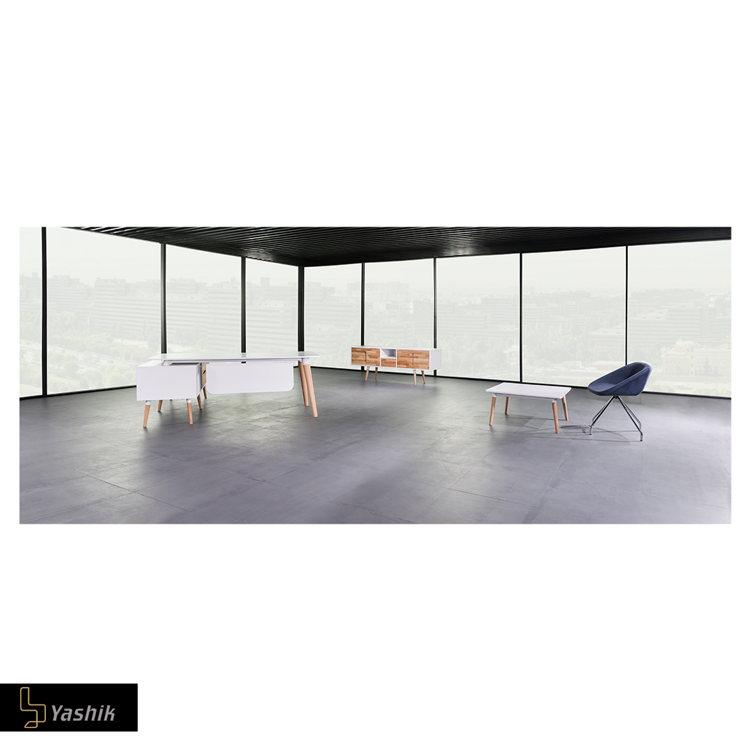 - میز اداری مدیریت 1004 یک میز مدرن ، ساخته شده از صفحات فینگرجوینت (چوب راش)، ام دی اف و پایه های چوبی ، که با ظرافت خاصی طراحی شده ، این تلفیق جذاب طرافداران بسیار زیادی دارد و ضمناً این مدل دارای ست می باشد که استفاده از این ست ، جلوه بی نظیری به اتاق مدیریت می بخشد. تمام موارد استاندارد در این مدل لحاظ گردیده است . صفحه این میز از ام دی اف 16 میلیمتری و نمای بیرونی میز دارای فضایی جهت قرار دادن اشیا دکوری و کتاب که زیبایی و کاربری آن را دو چندان می نماید . برای کنسول این مدل 4 کشو مجهز به ریل آرام بند مخفی در نظر گرفته شده و با طراحی خاص بر روی درب کشو ها به عنوان جایگزینی برای دستگیره ، تکمیل کننده سبک مدرن می باشد . بنا به درخواست مشتری ، امکان سفارش با کنسول راست یا چپ و ارسال محصول به صورت مونتاژ یا دمونتاژ ( کارتنی ) امکان پذیر می باشد.