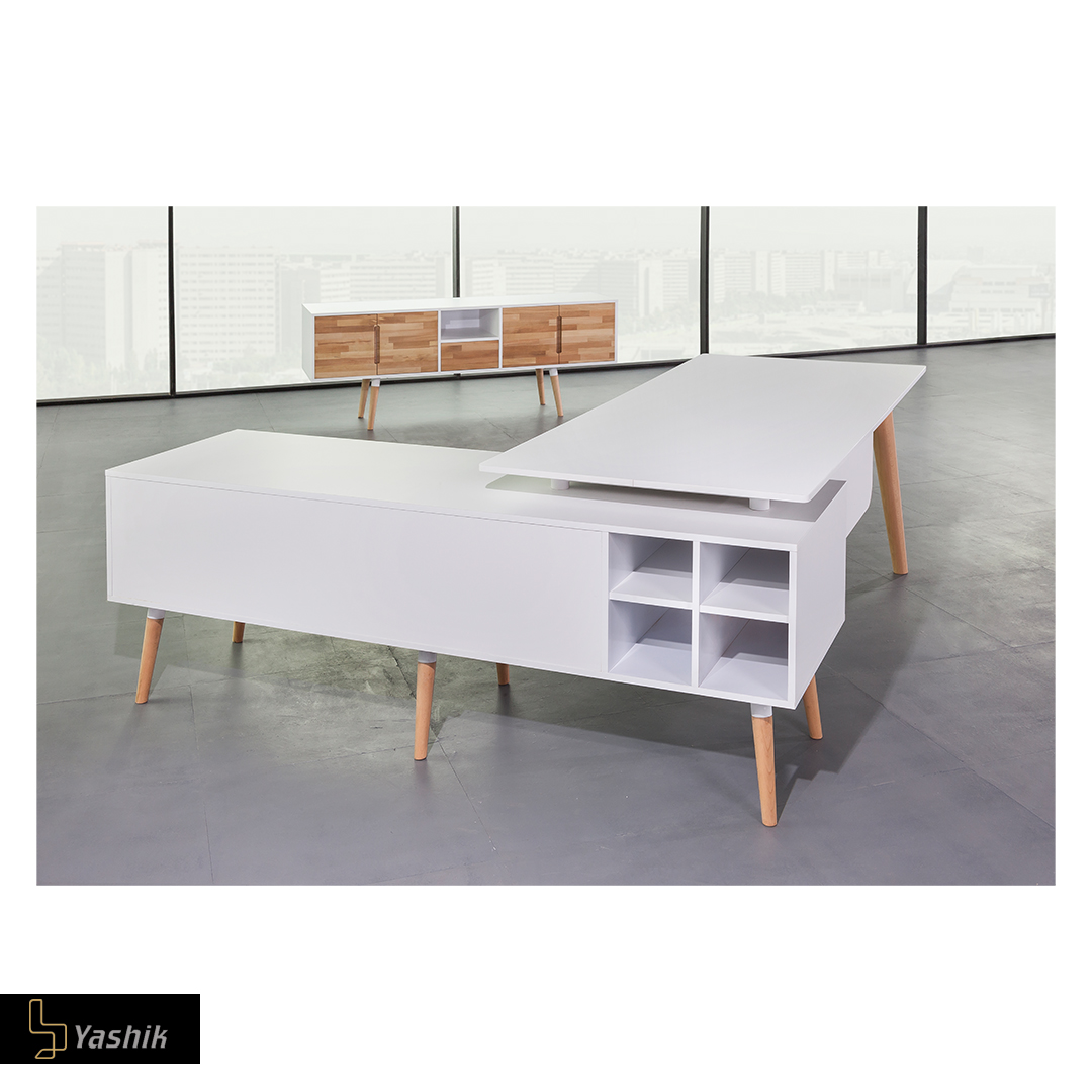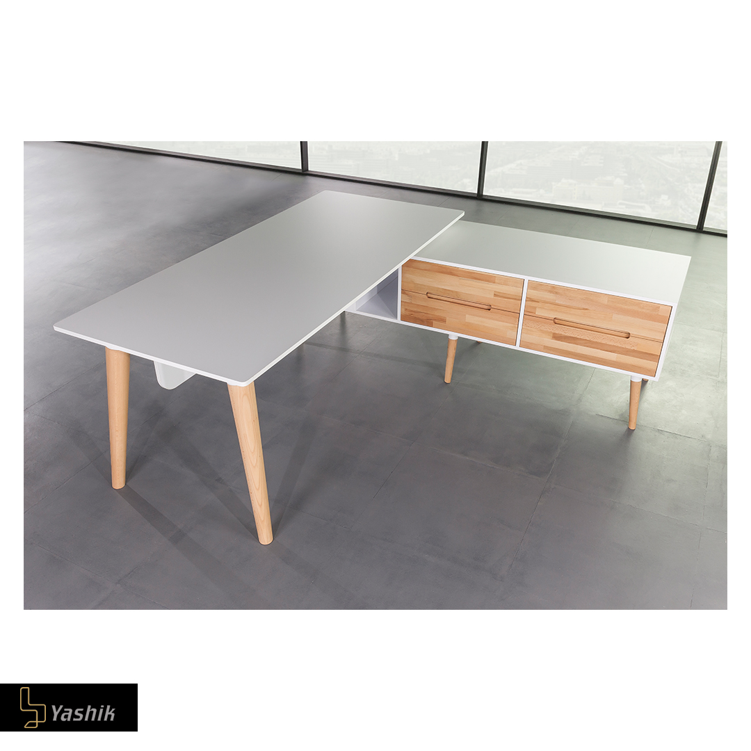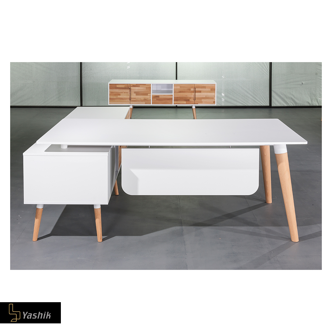 - میز اداری مدیریت 1004 یک میز مدرن ، ساخته شده از صفحات فینگرجوینت (چوب راش)، ام دی اف و پایه های چوبی ، که با ظرافت خاصی طراحی شده ، این تلفیق جذاب طرافداران بسیار زیادی دارد و ضمناً این مدل دارای ست می باشد که استفاده از این ست ، جلوه بی نظیری به اتاق مدیریت می بخشد. تمام موارد استاندارد در این مدل لحاظ گردیده است . صفحه این میز از ام دی اف 16 میلیمتری و نمای بیرونی میز دارای فضایی جهت قرار دادن اشیا دکوری و کتاب که زیبایی و کاربری آن را دو چندان می نماید . برای کنسول این مدل 4 کشو مجهز به ریل آرام بند مخفی در نظر گرفته شده و با طراحی خاص بر روی درب کشو ها به عنوان جایگزینی برای دستگیره ، تکمیل کننده سبک مدرن می باشد . بنا به درخواست مشتری ، امکان سفارش با کنسول راست یا چپ و ارسال محصول به صورت مونتاژ یا دمونتاژ ( کارتنی ) امکان پذیر می باشد.