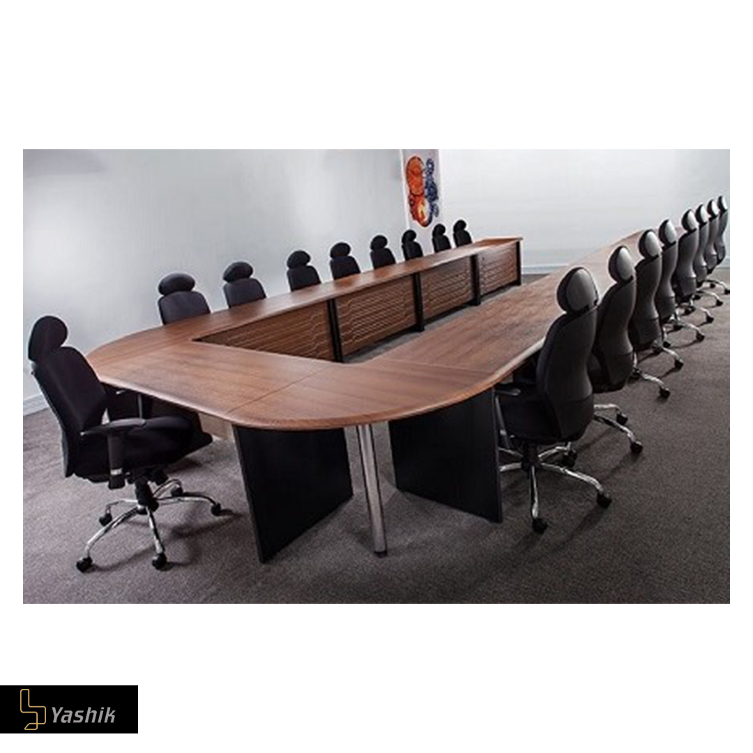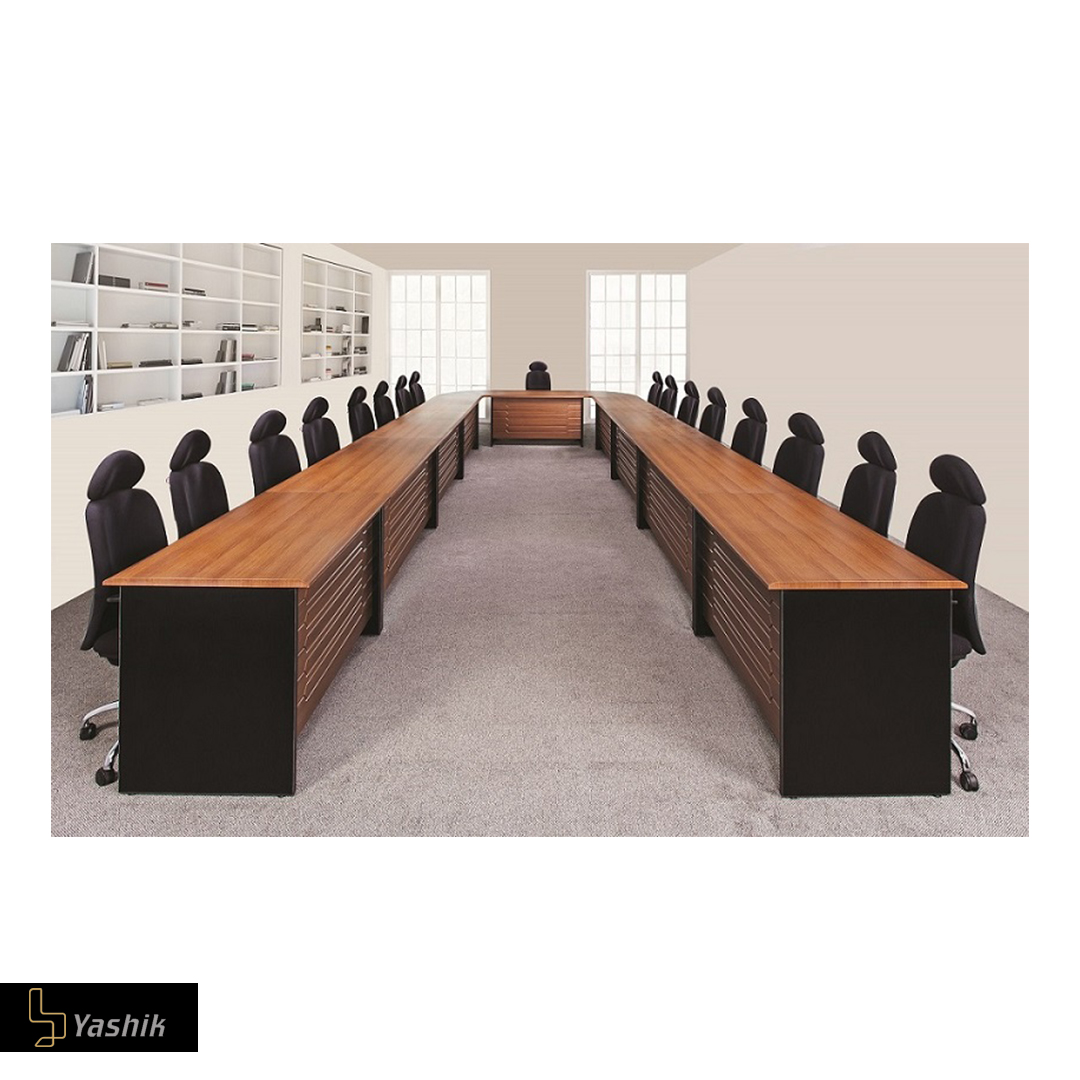 - قرارگیری چند میز چوبی در کنار هم و تشکیل یک میز کنفرانس سراسری